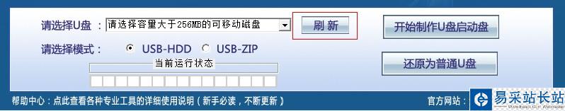 制作第2步:插入您將要制作的U盤,并點擊軟件下方的“刷新”按鈕,程序?qū)⒆詣訉ふ矣嬎銠C(jī)中的U盤盤符。