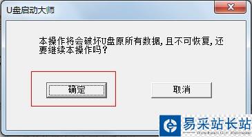 制作第5步:這個時候會彈出一個提示框,提示您是否已經(jīng)備份好原U盤數(shù)據(jù),點擊“確定”即可開始制作