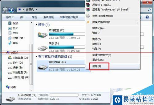 6、返回計(jì)算機(jī)主窗口,右鍵單擊u盤圖標(biāo),在彈出的選項(xiàng)中點(diǎn)擊“屬性”項(xiàng)