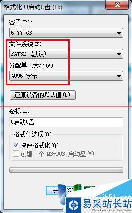 2、此時(shí)會(huì)彈出格式化u盤窗口,其中我們可以看到文件系統(tǒng)(FAT32)和分配單元大小(4096字節(jié))