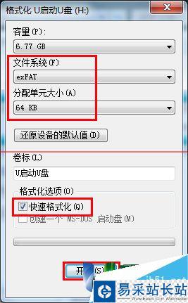 3、把它們分別都設(shè)置為exFAT和64KB,并勾選“快速格式化”,再點(diǎn)擊“開始”按鈕