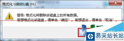 4、隨即彈出警告提示執(zhí)行此任務(wù)會(huì)刪除u盤上所有文件數(shù)據(jù)。由于開始的時(shí)候我們就備份好u盤文件數(shù)據(jù),所以點(diǎn)擊“確定”按鈕,確認(rèn)執(zhí)行