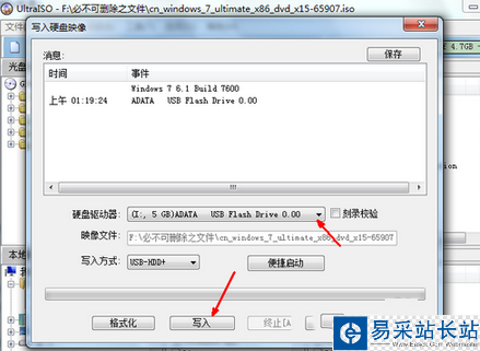 在寫入硬盤映像的頁面中,選擇好你所要制作的U盤。如圖示,“硬盤驅動器”里就是選擇你要刻錄的U盤,這里演示用的是一張數碼相機的內存卡。寫入方式默認是USB-HDD+,還有USB-HDD、USB-ZIP、USB-ZIP+,共四種供選擇,這主要取決于你的主板支持的啟動類型,可以在刻錄前進CMOS看一下,注意有的主板需要插入U盤才會顯示支持的類型。U盤可以在刻錄前格式化,也可以通過底下的“格式化”按鈕進行,當然直接點“寫入”也可以,會自動格式化。