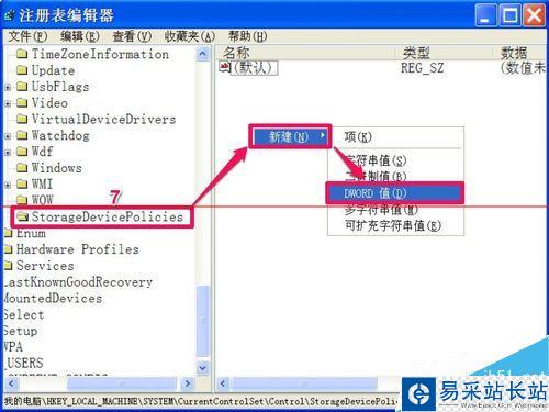 5、然后在StorageDevicePolicies這一項(xiàng)的右側(cè)窗口,在空白處右鍵,新建一個(gè)DWORD值。