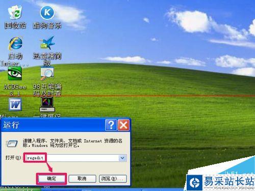 1、先打開“開始”菜單中的“運(yùn)行”程序,然后輸入regedit命令,確定。