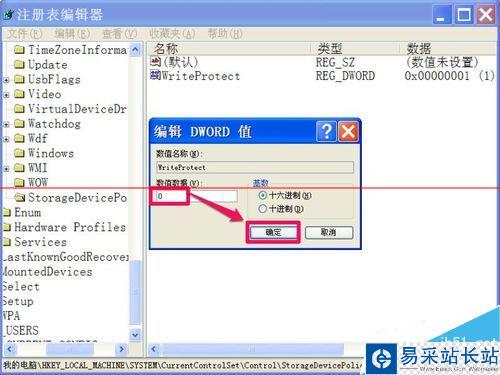 8、在“數(shù)據(jù)數(shù)值”下,將其值改為“0”,然后按“確定”保存并退出編輯DWORD窗口,然后重啟電腦,寫保護(hù)問題就解決了。