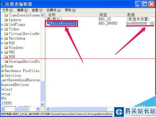7、如果之前有StorageDevicePolicies這一項(xiàng),也有右側(cè)窗口的WriteProtect這項(xiàng),如果值是“1”的話,雙擊WriteProtect這一項(xiàng),進(jìn)入編輯DWORD值窗口。