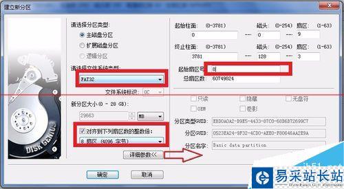 2)“對齊到下列扇區的整數倍”打上對勾,下拉菜單選擇“8扇區(4096字節)” 4096字節=4KB