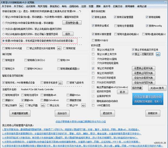 當然如果您覺得上述通過注冊表解除U盤寫保護的方法比較復雜,也可以通過專門的電腦U盤監控軟件來實現,例如有一款“大勢至U盤管理工具”(下載地址:http://www.grablan.com/monitorusb.html),不僅可以完全禁用U盤、禁止移動硬盤使用,有效防止通過USB存儲設備泄露電腦文件;同時,還可以只允許特定U盤使用、只讓從U盤向電腦復制文件而禁止從電腦向U盤復制文件。當然,也可以輕松恢復U盤使用、解除U盤寫保護、去掉U盤寫保護等。操作非常簡單,點點鼠標即可,如下圖所示: