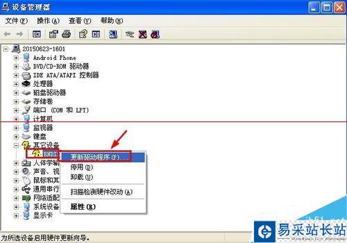 5、這時候在設備管理器中,在RNDIS設備上單擊右鍵,出現菜單點擊更新驅動程序。