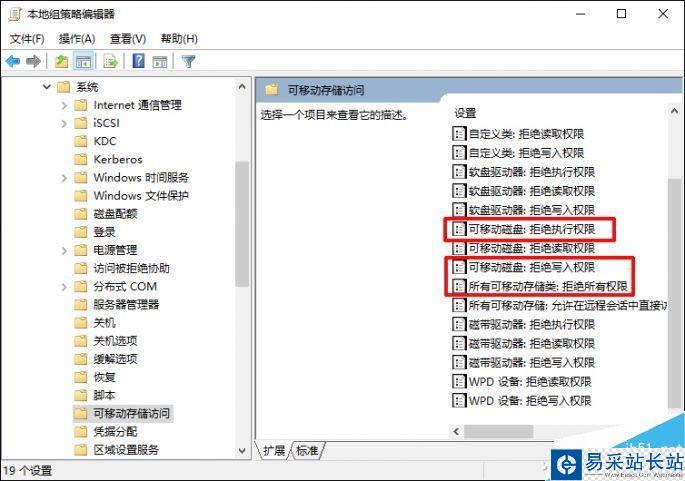 在“本地組編輯器”中依次點(diǎn)擊“管理模塊→系統(tǒng)→可移動(dòng)儲(chǔ)存訪問(wèn)”,分別進(jìn)入圖中加入了紅框的3個(gè)選項(xiàng)的配置界面。