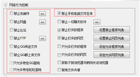 此外,通過大勢至USB禁用軟件還可以完全禁止電腦發(fā)送郵件附件、禁止網(wǎng)盤上傳電腦文件、禁止QQ發(fā)送文件、禁止FTP文件上傳等,從而全面保護電腦文件安全,防止通過網(wǎng)絡途徑泄密的行為。如下圖所示: