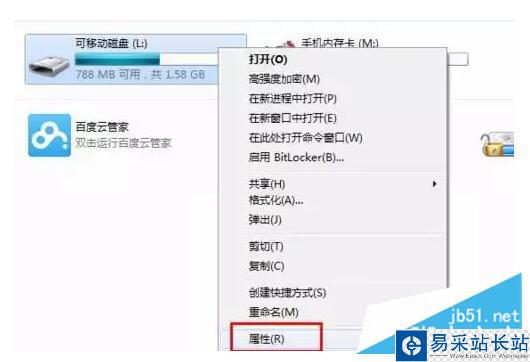 1、當電腦能夠正常識別U盤時,我們可以對U盤進行一次嘗試修復操作。右擊U盤盤符,從彈出的菜單中選擇“屬性”。