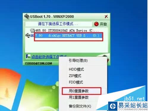 2、運行USBOOT程序,選擇選擇要修復的U盤,然后點擊“選擇工作模式”下拉列表,從中選擇“用0重置參數”項。