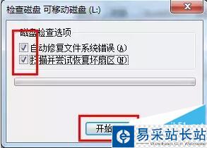 3、在彈出的窗口中,勾選兩項,并點擊“開始”按鈕來嘗試修復U盤寫保護錯誤。
