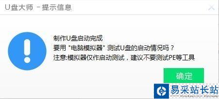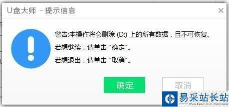 點擊開始制作,彈出如下彈窗,點擊確定,U盤大師將會開始制作U盤啟動盤(此時U盤上的數據會被清空)
