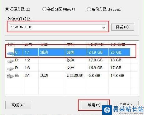 進入pe系統u盤啟動pe裝機工具會自動開啟并識別u盤中所準備的win7系統鏡像,可參照下圖的方式選擇磁盤安裝分區,接著點擊“確定”即可: