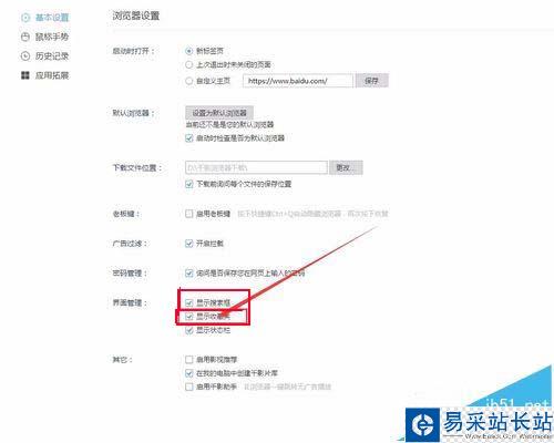 6、在“基本設(shè)置”選項(xiàng)下,找到“界面管理”下的“顯示搜索欄”和“收藏夾”選項(xiàng),并將其復(fù)選框勾選即可。如圖所示