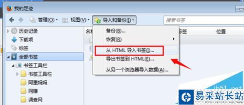 以上是導出,如果要恢復的話。同樣找到書簽菜單欄,導入和備份功能找到”從HTML導入書簽“即可恢復啦