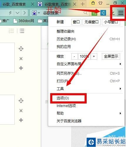 3、打開(kāi)百度瀏覽器的設(shè)置,點(diǎn)擊“選項(xiàng)”,如圖所示: