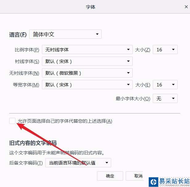 6、把該設置項前面的勾選去掉,最后點擊確定按鈕。這樣以后打開的網頁字體就會完全一樣了