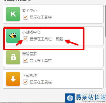 5、點擊以后,我們找到我們玩的這個游戲的按鈕,我們可以點擊前面的對勾,不讓顯示,也可以直接卸載掉。