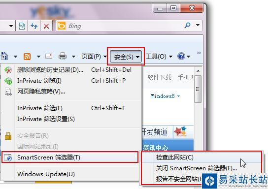 IE8以及更高版本瀏覽器中的SmartScreen 篩選器提供了手動檢查指定網站安全性的功能。使用方法很簡單,只需先在IE8瀏覽器中轉到希望檢查的網站,選擇菜單“安全”—“SmartScreen 篩選器”—“檢查此網站”。
