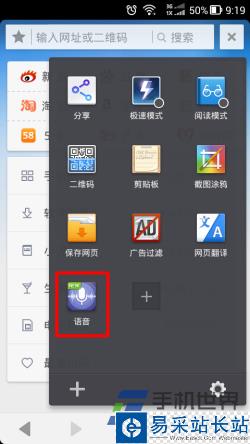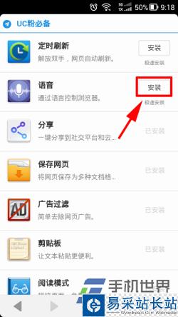 1)下載安裝并打開新版的UC瀏覽器,在首頁點擊右上角的圖標,在彈出的窗口中點擊“+”進入UC粉必備界面。點擊安裝“語音”。