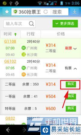 3)點擊購買后,找到你要的班次和席別,點擊“購買”。