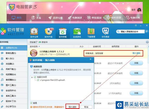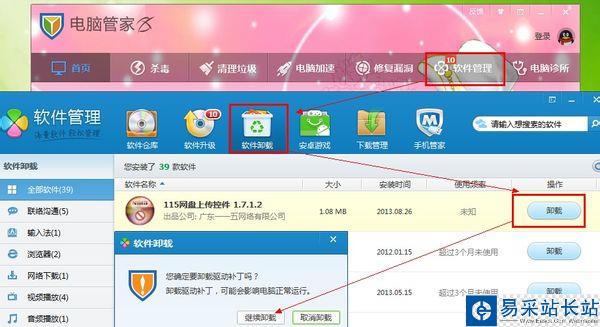 我用騰訊電腦管家舉例(免費安全軟件,殺毒+管理2合1)。打開電腦管家——軟件管理——軟件卸載。電腦管家是直接把軟件卸載同時把注冊列表也就清理了。(有的軟件重啟后會自動刪除)