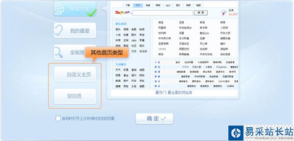 第一次啟動瀏覽器時的設(shè)置方法:在第一次啟動搜狗高速瀏覽器時,會打開首頁選擇界面,包括“網(wǎng)址大全”、“我的最愛”、“全能搜索”和“其他”四種類型,選中首頁類型,點擊下面的確定按鈕即可,如下圖所示。