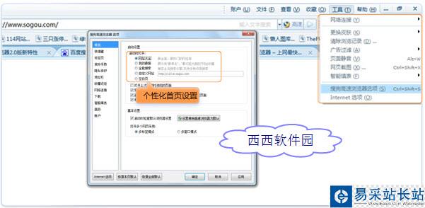 菜單選項中的設(shè)置方法:點擊菜單欄工具選項,然后點擊搜狗高速瀏覽器選項;在常規(guī)的啟動設(shè)置中,可以自由設(shè)置“網(wǎng)址大全”、“我的最愛”、“全能搜索”、“自定義網(wǎng)址”和“空白頁”這五種類型,如下圖所示。