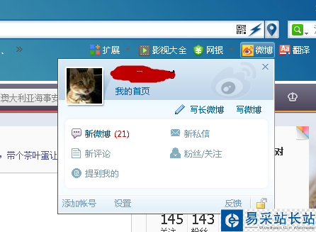 2.單擊“安裝”后,在瀏覽器上方即出現微博的圖標,如果你還沒有微博,先注冊一個,若是已有微博賬號,那么單擊“立即添加”。