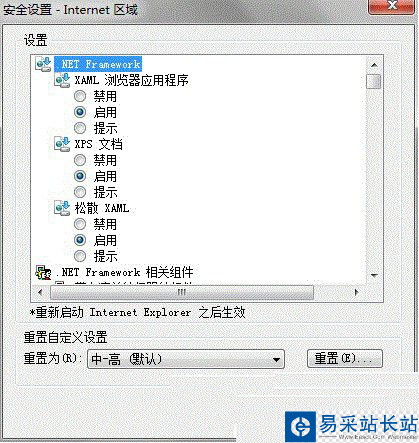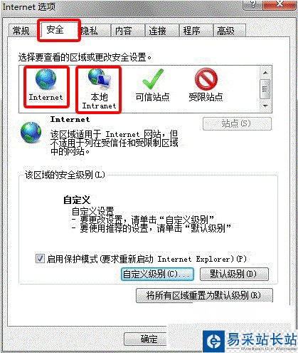 2. 在Internet選項中選擇“安全”選項卡,其中安裝級別設置包括“Internet”和“本地Internet”,其中“Internet”安全設置 適用于Internet網站,但不適用于列在受信任和受限制區域中的網站;“本地Internet”中的安全設置 適用于在您的Internet上找到的所有網站;