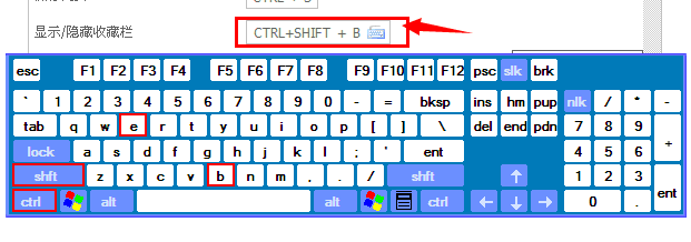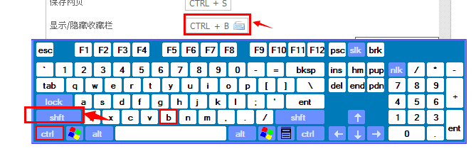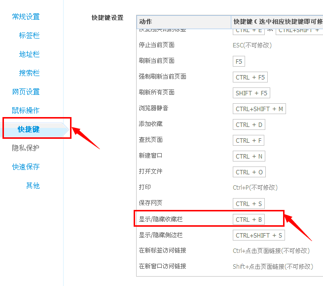 然后 點擊左側的 快捷鍵 右側往下拉定位到 顯示/隱藏收藏欄 (ctrl+b)