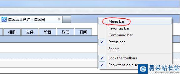 1. 在IE9的工具欄上單擊右鍵,選擇Menu bar,顯示菜單欄。
