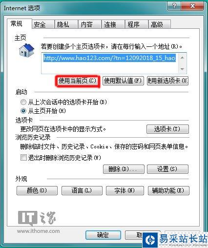 2、打開Internet選項,選擇常規,點擊主頁欄目的“使用當前頁”;