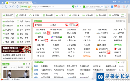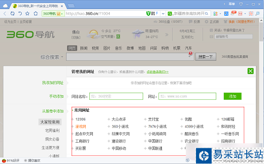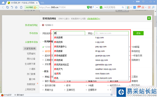 二、在“管理我的網址”窗口中選擇下面360提供的網站點擊添加即可