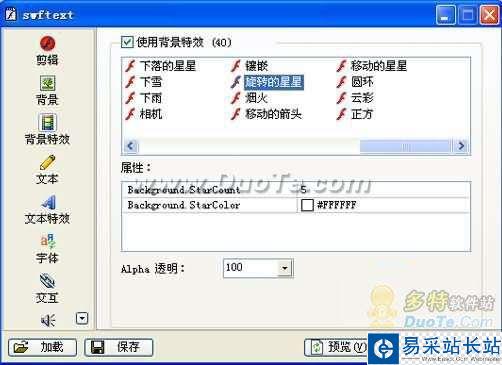 2) 一個搶眼的Flash特效文字,使用恰當背景特效很重要。SWFText提供了40種背景特效任你選擇,每一種背景特效都可以單獨設置屬性及亮度,使之與背景和文字搭配更協調。如圖6所示