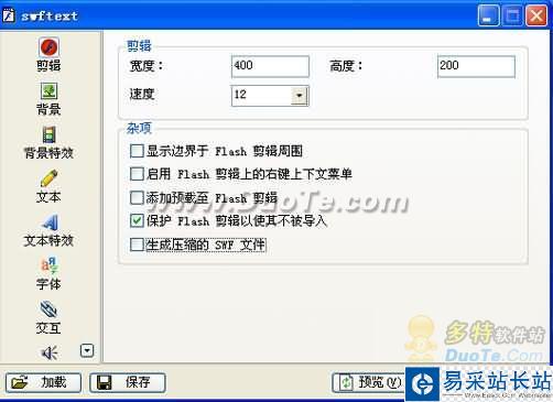 一款非常棒的 Flash 文本特效動畫制作軟件,可以制作超過 168 種不同的文本特效和 40 種背景特效,可以完全自定義文字屬性,包括字體、大小、顏色等等,使用 SWFText 完全不需要任何的 Flash 制作知識就可以輕松的做出專業的 Flash 廣告條和個性簽名!
