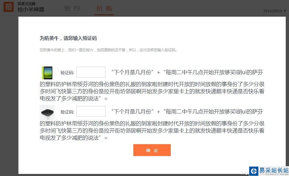 小米奇葩的驗證碼!這里大家都看過來吧,當12點搶購真正開始的時候,小米官網(wǎng)會彈出驗證碼,此驗證碼非一般怪物,需要耗費無數(shù)腦力,一定要以面決戰(zhàn)高考的心態(tài),心無雜念專心填碼,以防智商不夠用,耽誤搶購良機!如下圖(僅舉例):