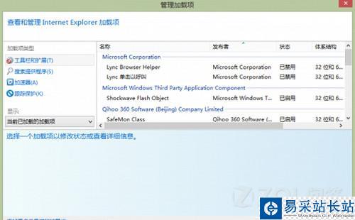 以Windows 8.1自帶的IE11為例,它所采用的外部插件的管理方式為加載項的管理方式。當一個軟件向IE添加更多功能時,必須要通過IE的加載項管理器的認可方能完成功能添加。添加的功能以列表的形式存在于加載項管理器中,用戶可以隨時啟用或關閉任何加載項,以實現外插功能的啟用或關閉。