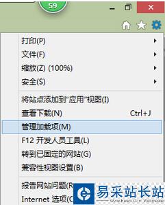 如果要對IE中的加載項進行管理,只需點擊IE右上角的齒輪裝設置按鈕,在彈出的菜單中選擇“管理加載項”即可開啟管理加載項窗口。IE支持四種不同類型的加載項,包括可視化搜索、加速器、網頁快訊、工具欄等。