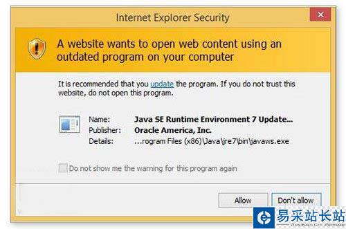 例如大家熟悉的Java控件,也是IE最易攻擊的瀏覽器插件之一,因此IE8-IE11將自動阻止舊版Java運行(參考上、下圖)。