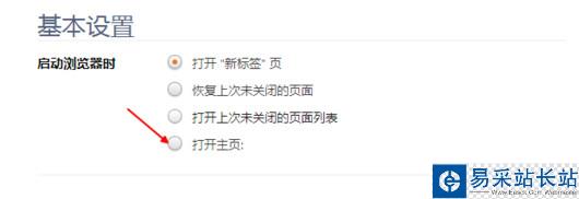 第四步:點擊以后,我們就把第一項瀏覽器打開時后面選擇到打開主頁這個按鈕上。