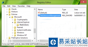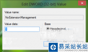 3、接著在上圖窗口中的右側(cè),找到NoExtensionManagement(REG_DWORD)(值應(yīng)該為1)雙擊,打開如下窗口;