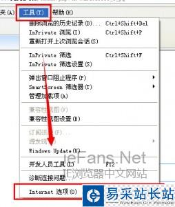 1、打開IE8瀏覽器,點擊“工具”在彈出的下拉框中找到“Internet 選項”。