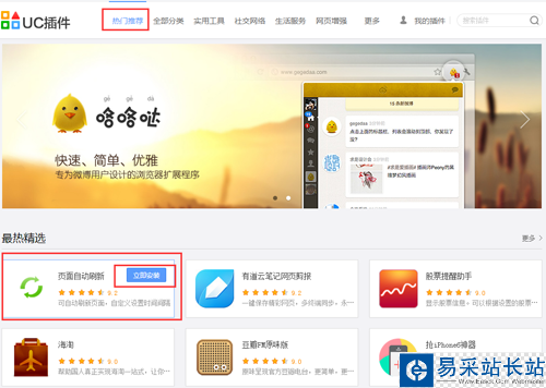 2、在彈出的方框,選擇【熱門推薦】---【頁面自動刷新】點擊【立即安裝】