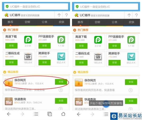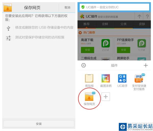這下就到了UC插件中心來了,這里有許許多多的插件,可以幫助用戶更好的使用瀏覽器。而保存網頁就在首頁精品推薦的第一個啦!選擇“安裝”。