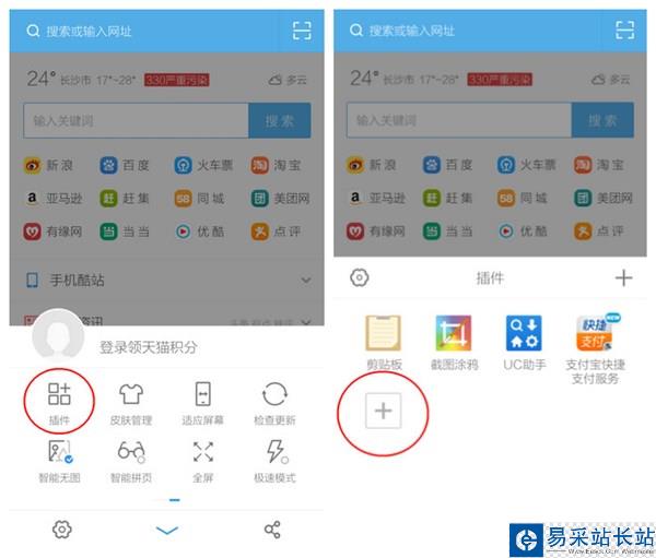 咦,怎么沒看到呢?原來插件里只有UC默認的幾個最常用的功能,如果想要更多的插件,就需要添加,打開“+”選項。